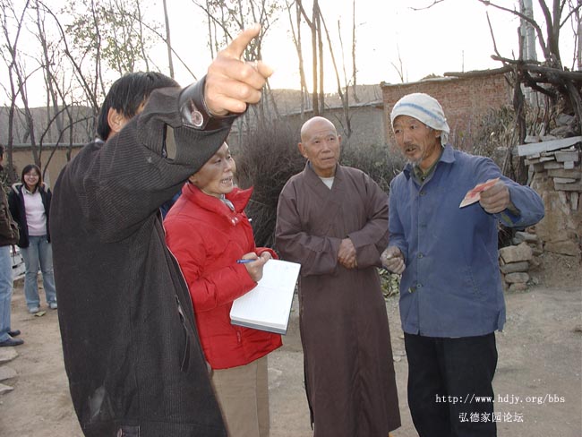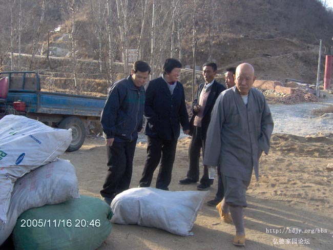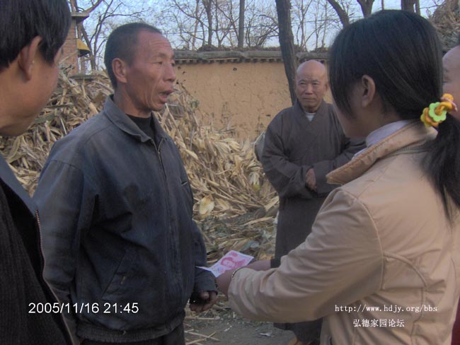 天色暗下来了,我们该下山了,忽然发现老人就在前面不远的地方,说想赶回去又怕错过了我们的车,就在这里等着,说不让我们跑路,就等着她回家拿核桃和柿子。冯常瑾他们想起车上还有一包准备捐的衣服,决定送给老人和她的家人。没有下车,就将衣服塞在老人怀里,车子开动了,回头看看,看见了老人的泪水。任超说,这大概是老人一年里最幸福的一天,老人一定以为遇上了活菩萨。我觉得我们虽然距菩萨的境地还太远太远,但那当下的一举一念便与菩萨无二。也第一次觉得学佛学菩萨的路并不遥远,只要时时念念如此便是。真的,100元,与小女上街转眼就花了,而在这里,却是一位年近70岁的老人一年的指望、幸福和满足。一路上大家谈着人生的价值,都觉得,把钱捐给这样的山里人,才是金钱的最大的价值和意义。