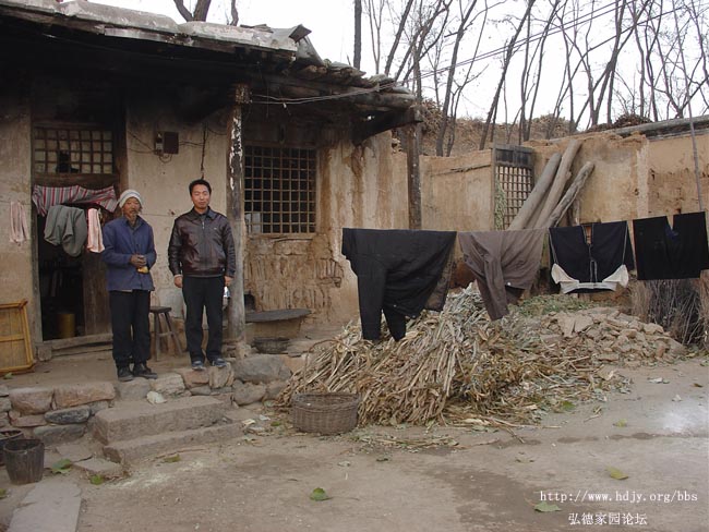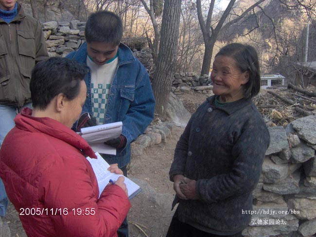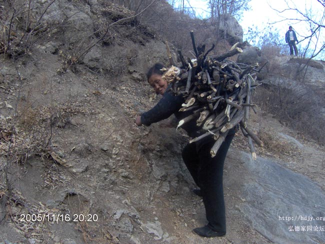 家住水泉洼的张美容老人砍完了柴,将柴放在梁上,也赶过来看望。老人今年68岁,老伴去世17年了,有一个儿子,还有两个孙女正念书。说自己每天翻过南梁,到北梁、西梁上到砍三四捆木柴,今天砍的一捆就放在半梁上。我们说去看看,便跟着老人爬梁。梁上又高又陡,没有路,老人在岩石上如履平地,我们跟在后面气喘吁吁、战战兢兢。到半梁上时,老人已经将七八十斤的木柴背在背上。冯常瑾、余华等分别试着背背柴捆,却怎么也背不起来。我告诉老人,这位叫余华的小伙子是个物理博士,老人茫然的望着我,不明白博士是什么。只是很高兴的告诉我们,她把1000多斤木柴卖给架线的人(不知是电信还是电力),人家看她年纪大了,不容易,给了她100块钱。今年收了山药蛋(土豆)、玉米,换了点白面,日子很是过得去。1000多斤木柴要几十捆,需要一位近70岁的老人翻山越岭十几趟,却只挣100元钱,我们听得有些惊讶、心酸。老人却心满意足,说山里人100元当10000元花,这100元大概是老人见过的最多的钱。我拿出100元钱给老人,说,您收下这100元,我不要您的柴。任超拿出了50元,同来的王立春拿出了10元(这大概是这个苦孩子的所有积蓄)。老人死活不收,说没有出力,不能白要钱。我将钱塞进老人的衣兜,老人说家里还有点核桃、柿子,如果看得起老婆子就收下。老人再三说,平白无故给了这么多钱,自己怎么也得有点意思。下梁时谁也没有说话,大概和我一样,一直在流着眼泪。