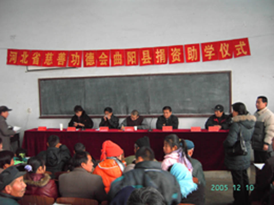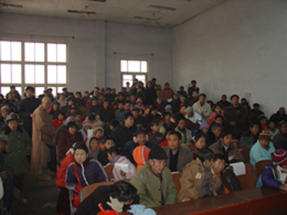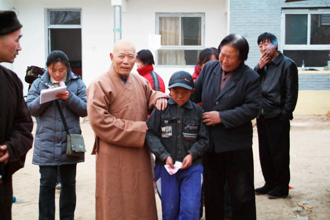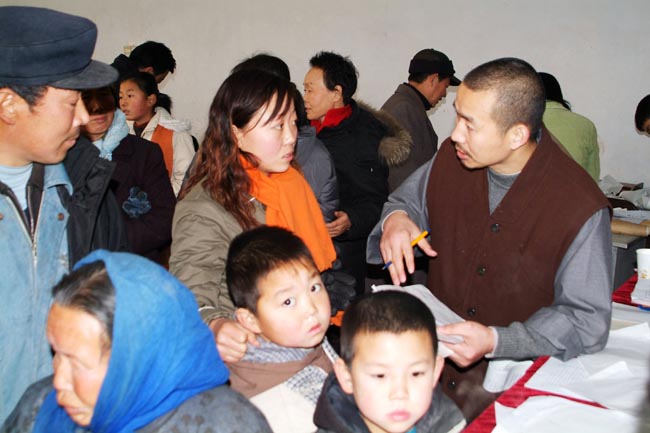 次日8点多,便有孩子和他们的监护人陆续来到资助现场所在的曲阳县职教中心,小罗和弘德家园曲阳藉孩子们也到了,天阴着,很冷。为了便于与孩子们交谈,我们将曲阳18个乡镇分成9个组,我负责横州镇与庄伙乡共15个孩子。他们是:盛宽长,男,8岁,父亡母嫁,奶奶残疾;牛玉刚,男,11岁,父亡母嫁,有爷爷奶奶;白萌,女10岁,父亡母嫁,跟叔伯爷爷生活;杨婷、杨叶琳姐妹(分别为7岁、3岁),是由双目失明的父亲带来的;刘红敏,女,13岁,母亲不在了(一般是从南方买来的媳妇,留下孩子跑了),父亲瘫着,由邻居送来;王立冬,男,14岁,他的姑夫说:“家里啥人都没有了,我也没人儿!”张裕栋,男,10岁,跟姑姑生活;陈玲,女,11岁,父亲去世,母亲生活不能自理;钟新强,男,家里什么人也没有了,跟着舅舅家的表姐生活;一位中年妇女带过来一位叫赵倩的文静女孩,说自己是孩子的姨儿,孩子是妹妹抱养的,妹妹妹夫均去世,她现在养着孩子。孩子很觉捏(方言,大意是很自觉),见活儿就干。赵倩在一旁一言不发,眼泪汪汪……因为听了弘德家园曲阳藉几个孩子的介绍,孩子们几乎全部报名要去弘德家园。依旧按照小学200元、中学300元将善款交到每一个孩子手里,常辉法师说,这是本会第一次资助曲阳县的苦孩子们,明年的这个时候我们再来,年年如此,资助每一个苦孩子完成9年义务教育。这是一个沉甸甸的承诺,这意味着从此本会每年多了数万元的付出,而孩子们将不会为区区一二百元的学杂费而辍学,更重要的是,有一丝的温暖让他们感到希望无限。