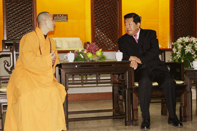 灵隐寺监院觉乘法师向全国政协主席贾庆林介绍寺院历史概况