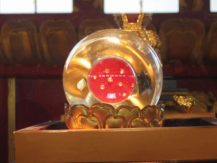 扬子晚报消息:西安庆山寺的释迦牟尼佛骨舍利等一批唐代的佛教文物,从本月13日起到22日在镇江丹徒区的大圣寺展出。昨天下午,记者在大圣寺藏经阁二楼看到,舍利珍珠球中装的正是13颗晶莹剔透的佛祖真身舍利。西安佛教文化研究中心副主任万广辉教授告诉记者,庆山寺原是武则天的道场所在,1985年13颗佛骨舍利出土时珍藏在金棺银椁中。图为珍珠球中的佛骨舍利。