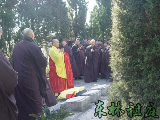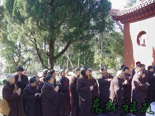 2005年12月22日,农历十一月二十二,冬至。下午一点半,东林寺部分四众弟子在首座本通法师的带领下,举行了缅怀祖师大德祭祀远公祖师塔、佛陀跋陀罗尊者塔、果一上人塔和圆华法师塔的仪式,最后在往生堂前作了回向。