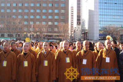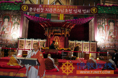 下午2时,在佛指舍利的供奉场所——釜山最大的会展中心(刚刚结束的APEC首脑会议即在此举行)举行了盛大的佛指舍利安奉暨智冠法师讲经法会。韩国佛教宗团协议会会长、曹溪宗新当选的总务院长智冠法师、韩国佛教总团协议会事务总长泓波法师,釜山地域佛教联合会会长、梵鱼寺住持大乘法师、釜山地域佛指舍利供奉委员会执行长、甘露寺住持慧聪法师,釜山地域佛教联合会常务副会长、天台宗三光寺住持道圆法师等韩国佛教界代表人物和来自韩国曹溪宗、天台宗、太古宗、观音宗、真言宗等二十多个宗派的500多名男女僧众代表以及一万多名佛教信徒参加了法会。釜山市副市长、市议会议长焦又刊(音)等政府要员出席法会并讲话,我驻釜山总领事王宝珍也应邀出席。