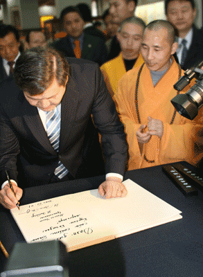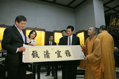 此外,总统一行还参观了天王殿、大雄宝殿、药师殿、文物馆等处,饶有兴趣地听取了觉乘法师对本寺历史发展、文物古迹、佛像殿堂等所作的介绍。寺内翠峰拥簇、古木参天、楼阁古雅的景致让总统一行赞赏不已。当听到灵隐寺已有1700年的历史、看到文物馆所保存的各种文物时,恩赫巴亚尔总统不禁为古刹建筑艺术之高明与文物保存之完善而发出了由衷赞叹。在大雄宝殿,总统还以蒙古特有的方式参拜礼佛,表达了虔诚之意及对友国的尊重。