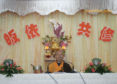 传明法师以禅宗特有的风格,针对当前信众念佛观念及方法的不当之处,用生动形象的,并且更有似于棒喝的语言,以浅显明了的事例作了绘声绘色的阐述。法师不但在事相上作开示,而且以幽默的语言,深入浅出地剖析念佛的精深义理。法会中,信众不时报以热烈的掌声和会意的笑声,在这轻松愉快的气氛中接受法师的批评和指导。法师以“皈依及念佛”贯穿整个法会,使大众于念佛中不忘三宝,于皈依共修或自修中更加信赖三宝,更加恳切念佛。