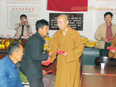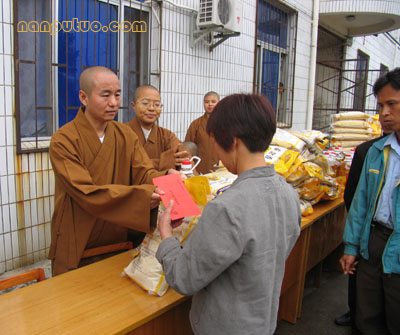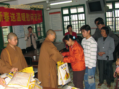 南普陀网站:随着农历新年的临近,我会开展的迎新年送温暖系列慰问活动正在紧张有序的进行中。元月19日上午,受厦门南普陀寺慈善会会长圣辉法师的委托,常务副会长慧然法师率领常务副秘书长普陀法师、办公室副主任正兴法师和慈善处德鸣法师及妙如法师、慧暄法师、觉明法师一行,由厦门市宗教局钟晓波陪同,在厦门市同安区汀溪镇政府和莲花镇政府分别进行了慰问,共为60户贫困家庭发放慰问金3万元和1200斤大米、120桶食用油等慰问品。