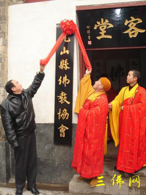 会后,与会代表和来宾在朝阳寺举行了简短的佛教协会揭牌仪式,林志富局长、妙侠法师、演新法师共同为光山佛教协会揭牌.