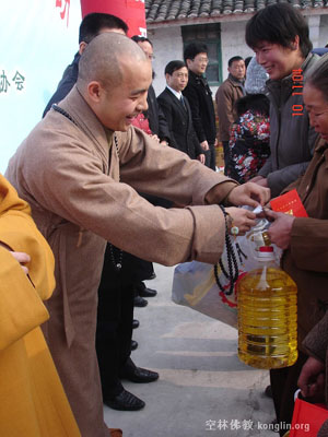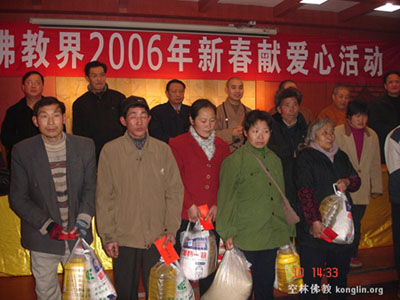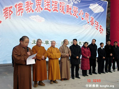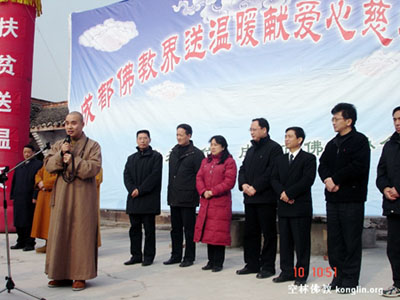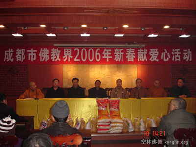 1月10日成都市佛教界“送温暖 献爱心”慈善活动在成都青白江区举行,由成都大慈寺方丈大恩法师主持,成都文殊院方丈宗性法师代表成都市佛教界发表讲话。活动共筹集了10万元善款,为青白江、新都等地的200户贫困家庭送上了新春的温暖,此举也拉开了成都市宗教界“迎新春献爱心”慈善捐赠活动的序幕。据悉,在今年春节前,成都市佛教界还将慰问成都龙泉驿区的100户贫困家庭。