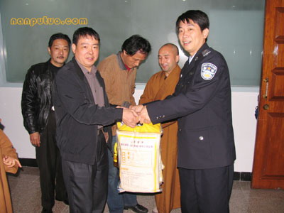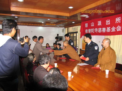 南普陀网站报道:元月18日上午,厦门市思明区碧山派出所3楼会议室里,洋溢着新春的喜气。遵照会长圣辉法师的嘱托,南普陀寺慈善会与碧山派出所在此间联合举行了新春慰问活动,警民共同为社区增添更多的祥和与温馨。活动中,南普陀寺慈善会向该所辖区厦港街道内的20户贫困家庭发放了一万元慰问金和40袋香米、40桶食用油等慰问品。