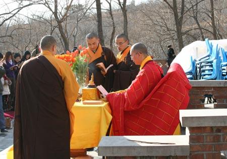龙泉寺方丈学诚法师(右一)在主持受戒仪式