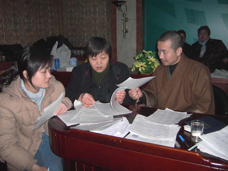 常辉法师和工作人员审阅孤儿资料