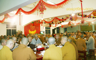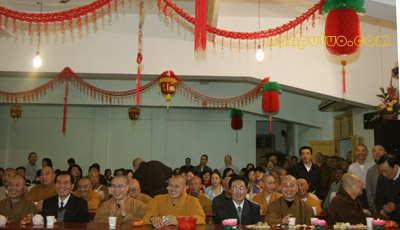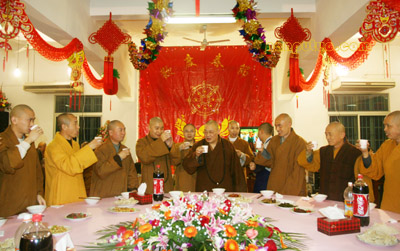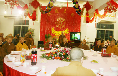 佛教在线1月29日消息 据南普陀寺网站报道:2006年1月28日(2005年除夕)南普陀寺上下充满了喜庆,全寺成员共同欢聚于南普陀寺五观堂共进晚餐,之后南普陀寺知客德煌法师主持进行集体茶话暨联欢晚会。中国佛协常务副会长、南普陀法主圣辉法师从北京赶回南普陀,和方丈则悟法师亲临喜庆现场同大家欢度除夕。厦门民宗局蔡永华副局长、厦门佛协常务副会长定恒法师以及佛教四众弟子、教内外同仁、来宾皆来赴会。喜庆的气氛、悦目的环境、美妙的乐曲汇成欢乐的海洋。厦门佛协与南普陀网站等媒体拍录下了这个美好良宵。