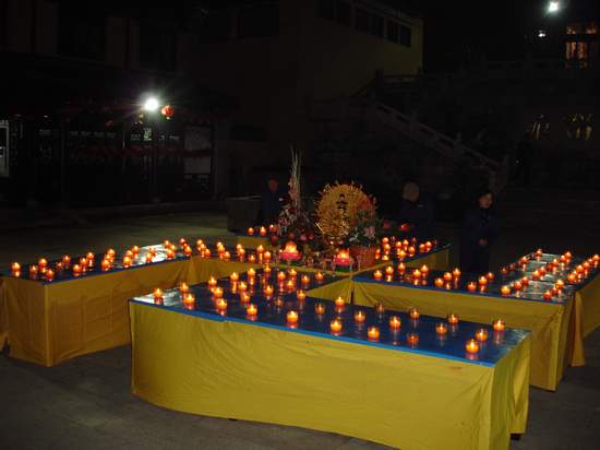 传灯活动由玉平法师主法,整个活动历时一个半小时,最后盏盏心灯在惠山寺西竺留痕广场摆成一个“卍”字型。