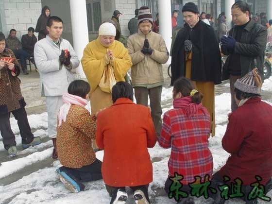 文楼村卫生所也很宽敞、整洁。觉海法师在宣传栏前驻足看了好一会。大家在货车那边发物品,但有四个女患者对我们非常感兴趣,问这问那,问完居士问法师。觉海法师也来和她们谈了谈,她们就要求皈依。说到做到,就在雪地里跪下来了。真是诚恳。觉海法师简要为她们传授了三皈依,这是文楼村的第一批佛弟子。其实路上刘书记也说,现在患者们生活不愁,但就是精神层面很缺乏。心灵的需求不是娱乐节目就能解决的。有些患者向我们问佛法,我们也顺便谈自己是如何用佛法解决身心疾病的,供他们参考。很多人对结缘品很感兴趣,围着法师们纷纷索请。