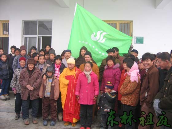 准备去卫生所那里发放慰问品时,有人想和法师们合影。于是觉海法师穿上袈裟,护生会的旗子展开在背后,大家欢欢喜喜地合了个影。