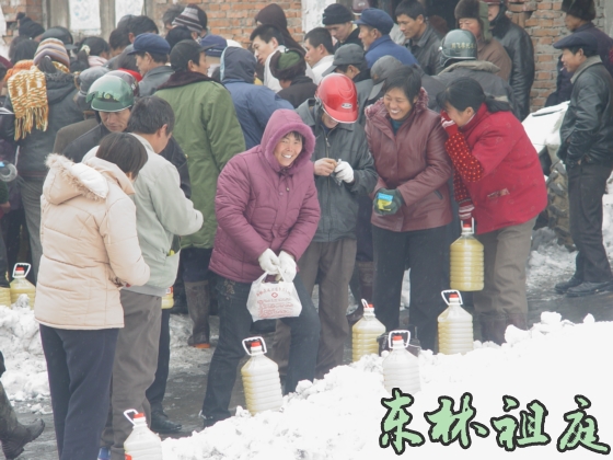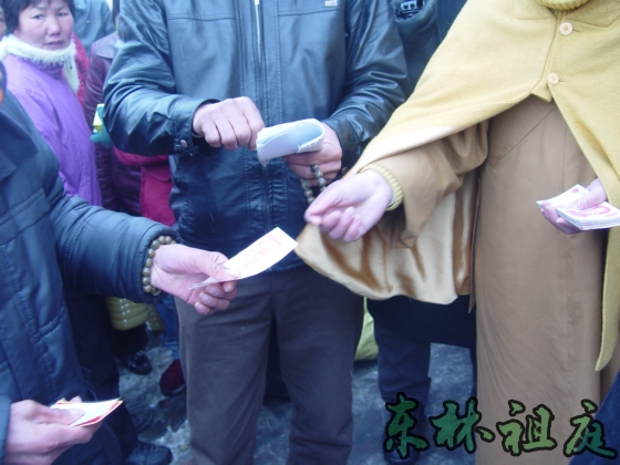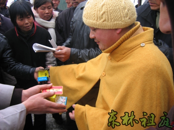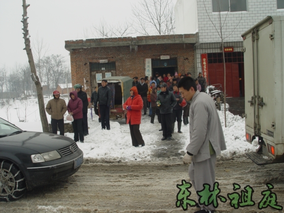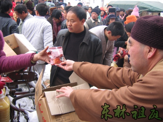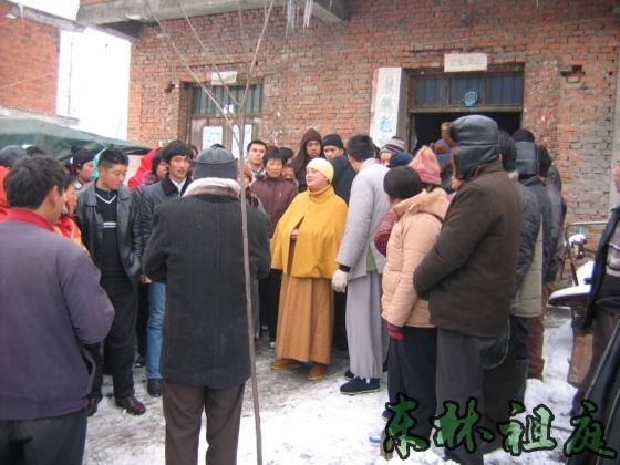远远地看到村口聚集了很多人。他们是由当地自发的爱心小组事先从四周村镇组织赶来的患者。简单寒暄几句后,觉海法师向大家介绍了我们送温暖的来意。接着由当地义工组织患者排队,按名单念着名字领取慰问品。由于人多,组织者经验不足,秩序不是很好。但觉海法师等却坚持身处拥挤的患者中,亲手发放食品和资金,其慈悲令人敬佩。要知道,有些患者非常敏感,如果戴上手套发放物品,就会引起他们的抵触。寒冷的天气中,师父们和患者们的手都有冻裂浸血的。所以在纷乱的环境里地赤手传递物品,确实具有一定的风险。总的来看,气氛还是融洽温和的。有些患者还主动索要了一些结缘的佛经、念佛机等法物。有些法师和患者们随意闲聊。我们刚见到那些病人时,他们的脸色是灰暗的,眼神是呆滞的。现在,我们从患者的脸色和眼神中看到了欢喜,看到了希望。