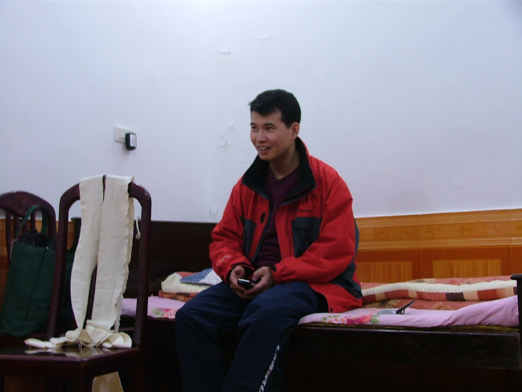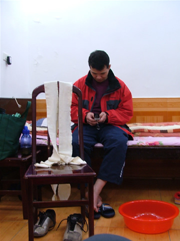 晚饭后,行脚团员开始每天必须的泡脚活动。每当这时也是我们开始闲谈的时候,也就是今晚这时,一位家住高和(注:发音)的李居士和一位杨居士乘车赶来拜访宋居士。敲开房门,宋师兄的脚还在水里泡着,就这样大家相互介绍后,落座攀聊起来,并约定明晨一起行脚。详情请看专题《真诚拜访,随喜行脚》。