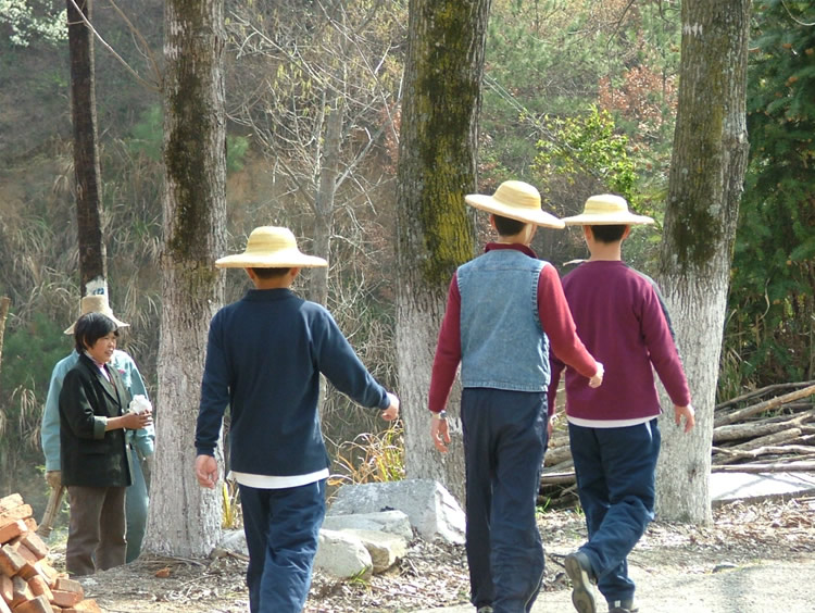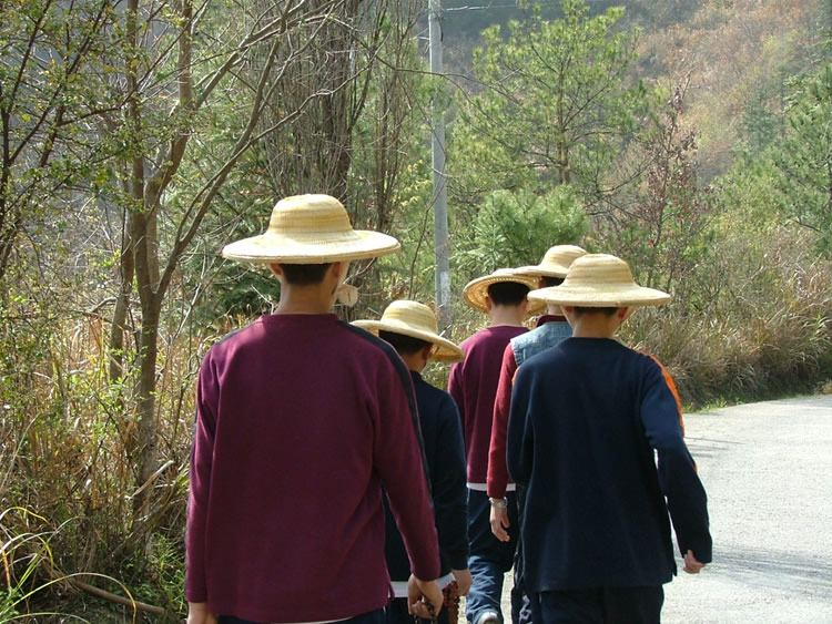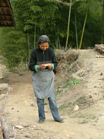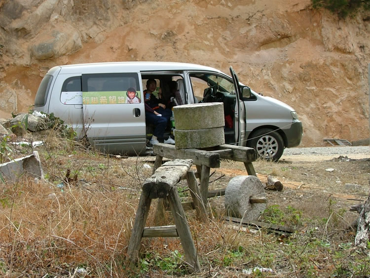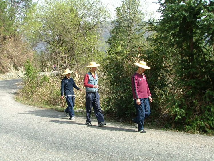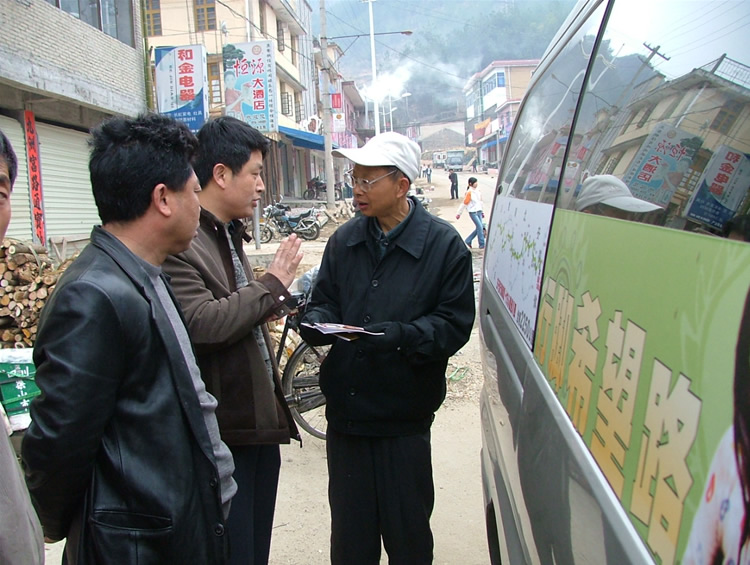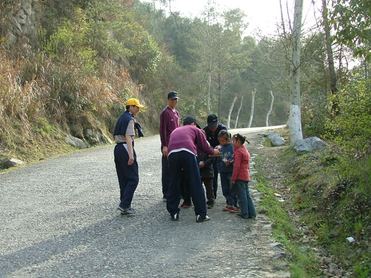 上午,行脚团的车子停在一个村口等后面的行脚团员过来休息。起初可能是我们的“新鲜”,当地的几个农民被吸引过来了,其中一个中年模样的男子凑过来,看着我们的海报,小王在一旁解释着我们活动的过程和意义,小王拿念佛珠与他结缘,这位农民兄弟听后啧啧称赞,你们是好人,好人。行脚团员都走过来了,我们又拿酸奶给这位农民兄弟结缘,农民兄弟起初走回自己家里,接着拿出一个暖水瓶,向我们打招呼,这是我们山上的野茶,给你们倒茶水喝,我不要酸奶,能不能再给一个佛珠。这样朴实的山里人,我一时竟然忘记了拍摄这最好的镜头,反应过来,茶水已经装了一大壶了,师兄们为我着想,连忙再把水壶里的水倒出来一些,喊这位山里兄弟,再给我们来一点。我再咔咔咔的过程中,这位兄弟一点都没有被影响到,也许是这位非常朴实的兄弟也被行脚团的行为感动着吧。