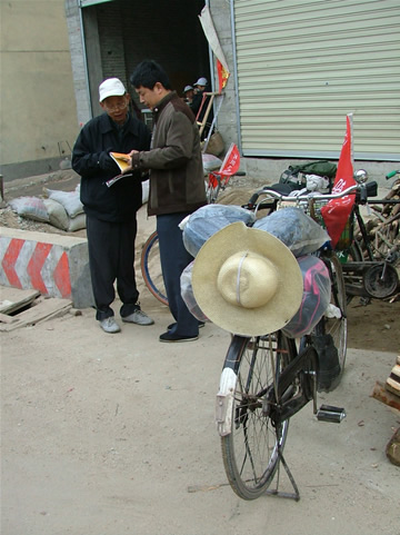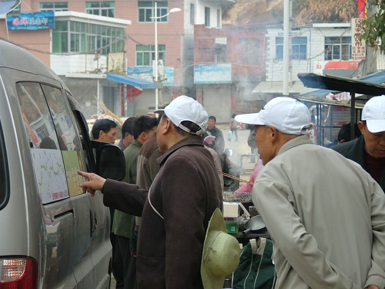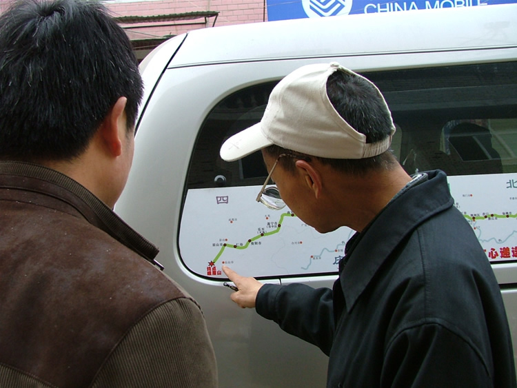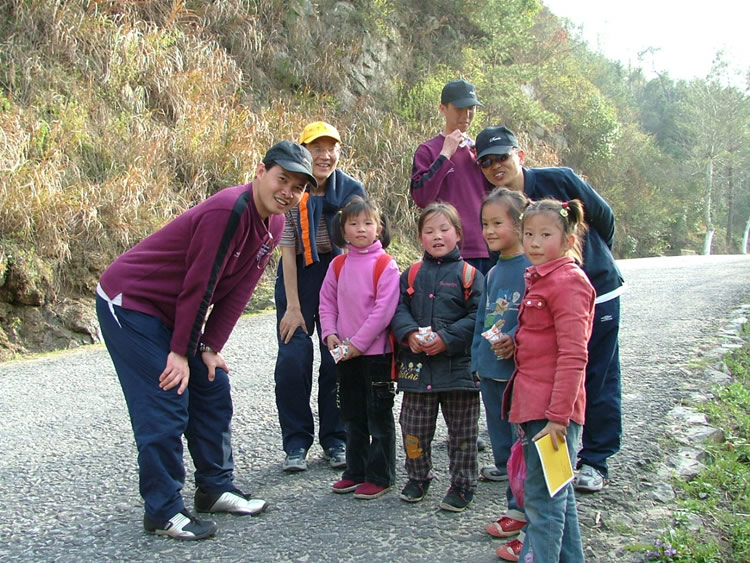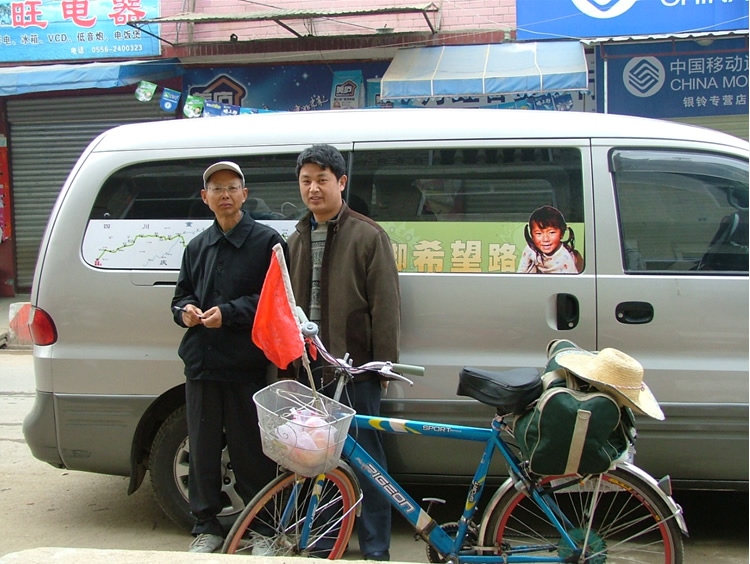 早上,我和小王司机去买早点,车停在一个早点铺子前面等待他们做当地特产馒头。一个老人家好奇的看着我们的车窗上的宣传海报,看到我们就问,你们这是去哪里啊,做什么的?我们的小王司机热情的说,我们是为希望小学培训贫困地区教师募集资金的,发心从九华山行脚到峨眉山,现在路过这里;你们呢?听口音不像是本地人。老人家说,你们是好人呢,我们是四川乐山沭川县的,我也是教师,现在退休了,我们一行四个出来骑自行车旅游的,我们去合肥方向;你们不简单啊,走这么长的路。同时也热情的介绍我们县离乐山很近,到四川来我们这里。小王司机也热情的欢迎来上海旅游,到时候联系我们。互相留了联系地址和电话,合影留念。