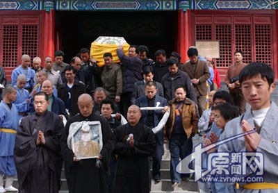 素喜老和尚的弟子抬灵柩在少林寺院内绕场一周