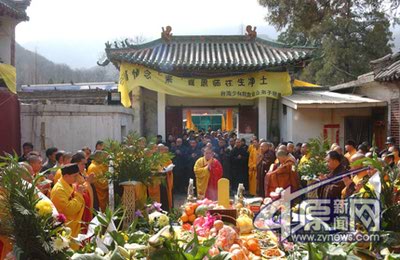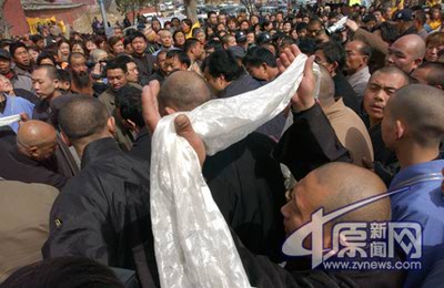 郑州晚报报道:3月15日是送别素喜老和尚的日子,在少林寺门前的少汲河岸边,一副副饱含深情的挽幛绵延300多米,从早上5时开始,来自国内外上万僧众信徒,不停地在素喜老和尚圆寂的圆通阁颂经助念“阿弥陀佛”。