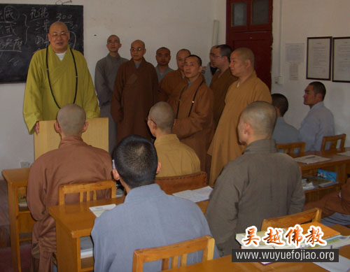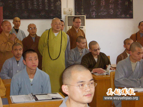 圣辉法师在二年级教室后静静地听着法师的授课,欣慰地笑了!