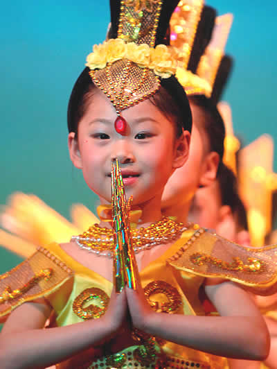 香港大公报网报道:3月25日,在郑州市中州影剧院,小演员们在表演舞蹈《千手观音》。近日,由河南省艺术幼儿园20名平均年龄不到6岁的儿童表演的舞蹈《千手观音》,在郑州市几次演出中受到好评。