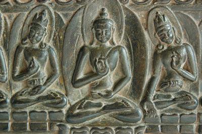 在年代上,根据佛的面部、三冠、手势、量度、莲台、背光、周边图纹及封浆程度等,经专家鉴定为公元十一世纪作品。