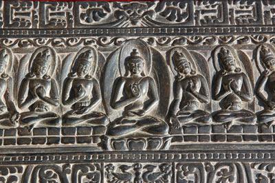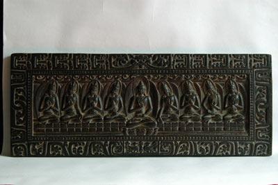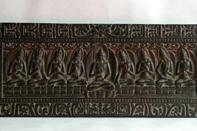 “大日如来及八大菩萨”经护板以高浮雕形式生动表现了释迦及二旁带冠的八大菩萨。上下为早期的吉祥鸟、兽及四周的忍冬草等图纹。材质为一种被西藏称为“金刚木”的高原珍贵木材。由于年代久远及油烟所致,呈现“腊黑”色,但可见细微的底部金斑。