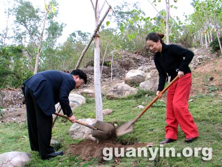 南海海上观音网报道:著名作家余秋雨先生于2006年3月3日携夫人游览南山观音苑景区,并于世界上最大的菩堤园--妙金山认植菩提树一棵,提写文联:为了人类和平 日夜守护观音。(编辑:一土)