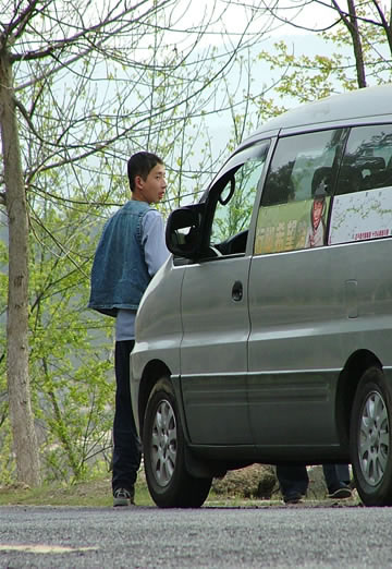 接下来,行脚团对水的需求量大大增加,车上带的矿泉水、酸奶都用光了,我们后勤要开车到镇上采购了。车子开到超市边停下,我们下车购物、我去附近买水果,平时为安全,惠烨留在车上,关窗锁门。可由于我们的疏忽,车子停在太阳下晒着,车厢温度升高,可怜的惠烨在经历高温的折磨1个多小时。直到我们接行脚团休息的时候,才委屈的说出当时自己的饱经高温折磨的情况,小惠烨师兄并没有怪怨我们,反而感谢我们为他又消除一个业障。宋师兄说,今天就有感应,行脚路上开过很多救护车,并且提醒我们注意当地的急救电话,一路上还有事情发生的。通过这件事情的发生,又让我再一次的忏悔自己的无明与我执之心。