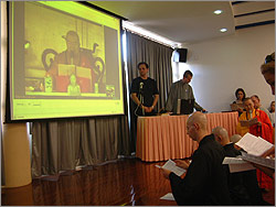 如来寺80位中巴信徒皈依,同步以葡文翻译。如来佛学院3位巴西及阿根廷籍同学发心出家,新出家同学面对网络中星云长师,如同现前,虔诚顶礼,纳受师父赐给之法身慧命及出家法名,佛门新亲家连夜赶路特来参加其儿子出家典礼,带着恭贺祝福之心,法喜充满。新出家者法名为慧力(ANGELO PAPIM)、慧势(MAULICIO CALIMAN)、如三(CECILIA)。慧力,196公分,曾任计算机网页设计师,巴西籍、计算机专科毕业。慧势,170公分,曾任运动教练及警察,巴西籍、体育系大专毕业。如三曾任行政管理员一职24年同一公司,阿根廷籍,目前皆为如来佛学院学生。