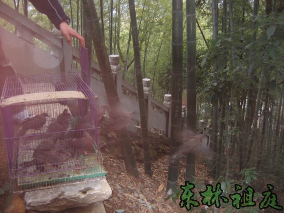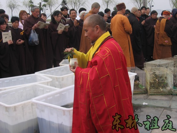 下午2点,十几位法师和二百多位居士在长江浔阳河畔共同为放生动物举行仪式。由东林寺首座本通法师主法。仪式结束后,鱼类放入长江,鸟类拉回东林寺在后山放飞。