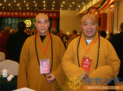 图:九华山百岁宫慧庆法师及九华山肉身殿圣富法师于佛协会议上