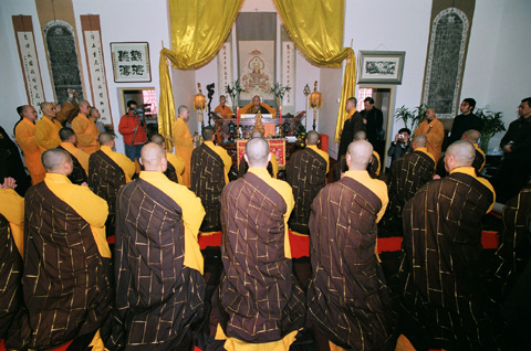 宣说法语毕,在大众虔诚虔诚恭诵“南无本师释迦牟尼佛”圣号声中,十七位接法禅人依次至老和尚座前问讯、接祖衣,披衣,至法座前拈香,展大具,长跪合掌。