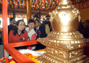 据了解,因为人数太多,要想瞻礼舍利,不得不排队等上数十分钟,才能依次进入。现场保安估计,前来瞻礼舍利的人比前日的安放仪式多了4倍,人流量在两万人以上。