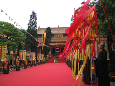 为了迎接与会高僧大德的参访,灵隐寺特意打开了山门,并在山门前铺上了红地毯。按照佛教界的惯例,寺院只有在迎接特别重要的人物或者举办特别重要的庆典时,才把终年紧闭的山门打开。
