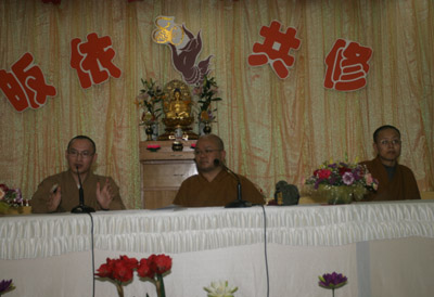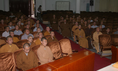 下午2时许,参加考试的考生齐集南普陀寺讲堂,在主席台上就座的有新加坡佛学院教务长传贤法师、副教务长传诚法师、教务主任传静法师。