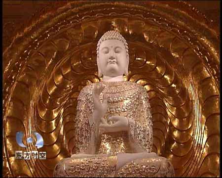 在我们佛法来讲,佛有佛国净土,所以在五楼就是佛国净土的世界,所以就是金碧辉煌,所以就是巴西的白玉石。这个佛像为什么采用巴西白石,就是石头里面的结晶,就是它有反光,不同角度有不同反光的特点。