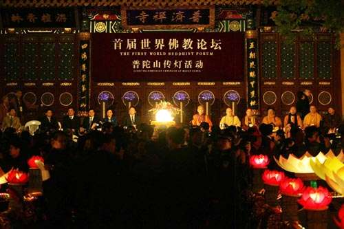 世界佛教论坛网站4月16日消息 「慧灯能破千年暗,薪火相传示善良」,首届世界佛教论坛主要活动之一的「无尽心灯夜夜明」传灯祈愿法会十五日晚在普陀山普济寺举行。