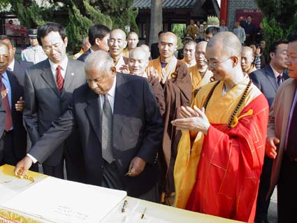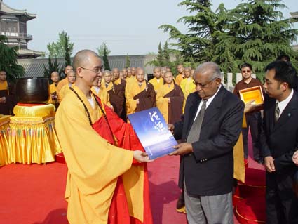 学诚法师说,我先后去贵国访问三次,受到贵国政府和佛教界的高规格的欢迎,和您们的大使都很熟悉,今天在法门寺能见您们,我们有缘。中斯佛教友好交往历史悠久,公元410年,中国晋代高僧法显从印度赴斯游学两年。现在我国有几位学僧在贵国留学,得到贵国的大力支持。