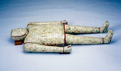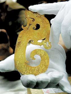 当很多记者感觉玉器体积太小,看着不够过瘾后,工作人员随后又运过来一个两米见方的深蓝色大箱子。打开箱子,是被白色无酸纸包裹的若干或圆或长的物品。工作人员剥开层层白纸,从中抱出一个玉片缀成的头颅,很多记者都异口同声地惊叹道“真漂亮呀!”记者看到,淡绿玉片虽然历经沧桑却依旧如新,由极细的黄金丝线连缀而成,人物的鼻子、眼睛等局部的玉片都是根据具体造型特制的。