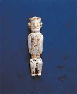开箱当天下午2时,记者按照约定时间准时来到世纪坛,和几家新闻媒体的记者在世纪坛工作人员的带领下,去看文物开箱。到达地点后,记者们被一再叮嘱和文物保持一定距离。约5分钟后,两位戴白手套的工作人员缓缓地推着一辆滚轴小车从亮着灯光的小门里走出来。记者看到,车子的平台上放置了几个大小不一的锦盒。一位工作人员小心翼翼地打开锦盒,从中取掉一块海绵,剥开一个白色小纸包,将一个乳白色的站立小玉人放在手中展示给大家。记者看到,玉人为方脸、阔嘴、细长目,双手举于胸前。参加当天开箱仪式的杨阳介绍说,别看这个玉人还不到8厘米高,但保守估价都得几十万美元,是1998年安徽省含山县陵家滩遗址出土的,距今已经5000多年了。当记者问它的主要用途是什么,杨阳指着器物背面的小孔说,可能是缝系衣服上的饰品。用于包装的海绵主要是防震,白纸是无酸纸,对文物没有伤害。