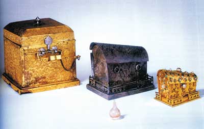 汇集了全国15个省市近50家文博单位的213件文物精品的“中华的文明——世纪国宝展Ⅱ”近日在京举行了开箱仪式。记者于当天有幸先睹为快,近距离欣赏了金缕玉衣、舍利子、秦陵石胄等数件备受关注的精品文物。据悉,这些将于2005年4月26日至6月15日在中华世纪坛露面的国宝,光是保险就高达11亿元人民币。