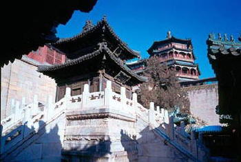 五台山显通寺坐落在台怀镇。它是五台山众多寺庙中最大、最古的一座。该寺历史悠久,珍贵文物很多,是佛教圣地中的一颗明珠。然而,在显通寺内最珍贵也是最值得一看的文物,却是千钵文殊铜像、铜殿和铜塔、无量殿、华严经字塔和重达九千九百九十九斤半的大铜钟。铜殿高八点三米,宽四点七米,深四点五米,是明朝万历34年(1606年)用铜十万斤铸成的。殿建平面见方,宽九尺,深八尺,高丈余,外观两层,内为一室,四角四柱,柱础似鼓。殿内上层四面6扇门,下面四面八扇门,殿内四壁上有小佛万尊,金光闪闪,灼灼照人。殿内四壁铸满了佛像,号称万佛;殿中央供奉着高3尺的铜佛。铜殿的每扇门由一个省铸造,文饰之美,工艺之精,实在是惊人的。殿内四壁上有小佛万尊,金光闪闪,灼灼照人。殿内四壁铸满了佛像,号称万佛;殿中央供奉着高3尺的铜佛。铸有各种图案和花卉鸟兽,如玉兔拜月、丹凤朝阳、二龙戏珠等,非常精致。,明月中,桂树下,有一只玉免昂首竖耳,目不转晴,胡须似动,十分机警。莲下仙鹤图中,一朵莲花正在盛开,一朵已结莲子,花上扑蝶,蜻蜓款款飞来,荷叶下,一只仙鹤双脚入水,嘴里叼着一条小鱼。一幅幅铸画,铸法精细入微,具有很高的艺术水平。据《清凉山志》记载,铜殿是五台山高僧妙峰于明朝万历年间,集全国十三省布施,用十万斤铜铸成。妙峰大师曾以舌尖之血和着朱砂书写《华严经》。万历皇帝的母亲李太后拜其为师,人称为“人天师表”,“法门砥柱”。妙峰大师曾铸一座铜殿,一在南京,一在峨嵋,一座在五台山,规格样式完全一样。前二者已失,显通寺的这座,是国内仅存的了。这座铜殿优美的造型,完整的结构,巧妙的布局,生动的图案,充分显示出我国古代高超的铸造艺术和劳动人民的智慧。细看门上的图案,各不相同,合起来却能浑然一体,天衣无缝。铜殿前下方左右两则,各矗立着一座铜塔,于1607年(明万历35年)铸成。铜殿之下左右两侧,有两个玲珑剔透的铜塔,两丈多高,亭亭玉立,铜锈斑斓,古趣盎然。