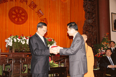 监院觉乘法师代表灵隐寺向连主席赠送檀香木弥勒佛像