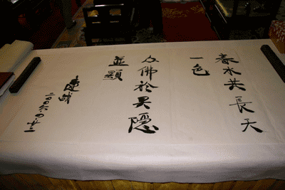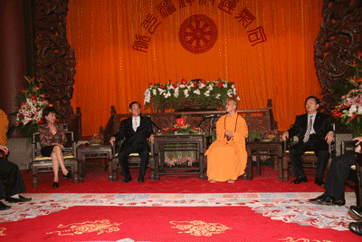灵隐寺监院觉乘法师率领两序大众对连战主席一行表示热烈欢迎。随后,连主席一行参观了天王殿、大雄宝殿、药师殿,还有文物馆,饶有兴致地听取了觉乘法师对灵隐寺近一千七百年悠久历史的介绍。在大雄宝殿里,连主席同夫人虔诚地上香问讯。一路上,寺内优雅的环境、宏伟的殿堂、珍贵的文物,让连主席赞叹不已。当听到灵隐寺刚刚同台湾中台禅寺缔结成为同源友好禅寺时,连主席连声说道:“很亲切、很亲切”,并对两岸“禅源一脉”表示高度认同。最后,连主席在直指堂挥毫泼墨,写下“春水共长天一色,众佛于灵隐并显”,并对觉乘法师的热情接待表示感谢。觉乘法师代表灵隐寺方丈木鱼长老,向连主席赠送了一尊檀香木弥勒佛像等礼品。临别前,连主席还亲切地同大家合影留念。