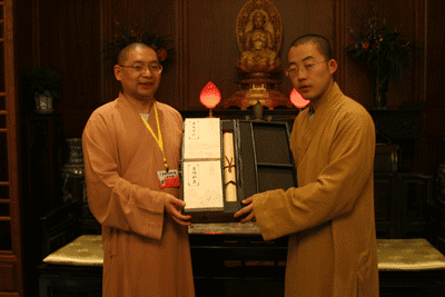 戒清法师代表灵隐寺馈赠《灵隐寺志》等法宝