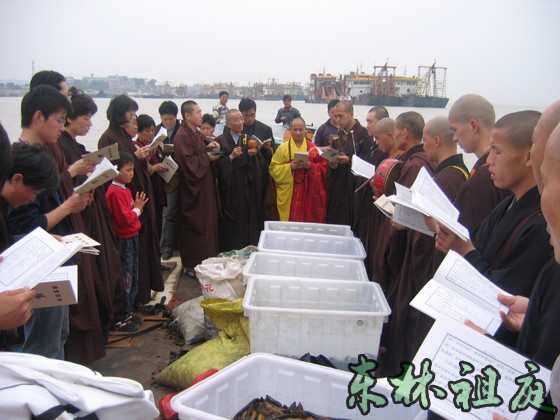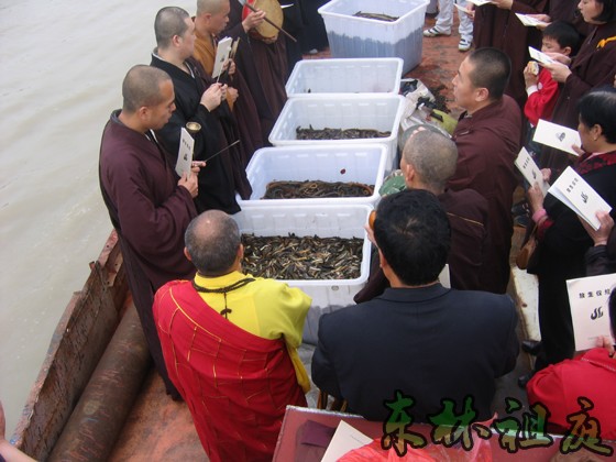 东林寺网站报道:2006年4月27日天气晴朗,东林寺护生会在鄱阳湖举行了一次放生,一共买了三万多块的生命,其中有黄鳝、泥鳅、田鸡等。河南商丘范王芝居士等一行4人也参加了放生。看到这么多差一点将被宰杀的苦难众生一条条进入自由的天地,我们的心情十分愉快,希望更多人加入到护生的行列中来。