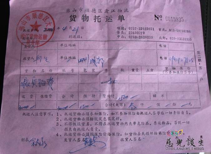 其中1500运费直接交给货运公司,另外1500元叫给丘涅让萨仁波切再成都,收到货物之后付款.